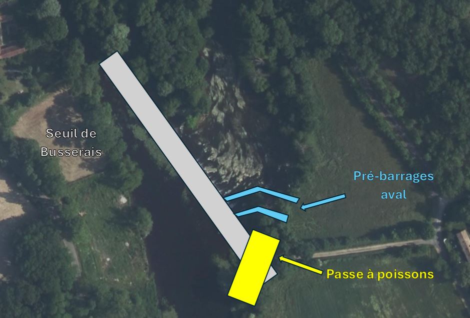 Après plusieurs années de concertation entre le propriétaire, les services de l’Etat et les financeurs, la solution technique retenue consiste à réaliser une passe à poissons en rive droite du seuil avec deux bassins successifs positionnés en aval. Cette solution permettra d’assurer la libre circulation de toutes les espèces piscicoles (grands migrateurs ainsi que l’ensemble des autres espèces présentes dans le cours d’eau) et des sédiments tout en maintenant la lame d’eau à l’amont en l’état, critère retenu comme prioritaire pour le propriétaire.