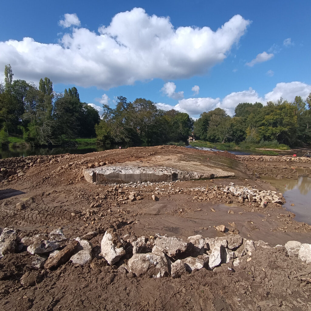 Les travaux de création du batardeau permettant la mise hors d’eau du chantier ont débuté le 15 septembre 2025. Une pêche de sauvetage a été réalisée par la Fédération Départementale de Pêche et de Protection des Milieux Aquatiques de la Vienne le 24 septembre 2025 avant la mise en assec total du chantier.