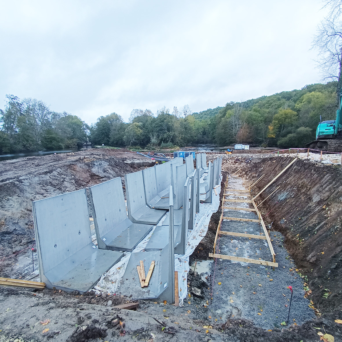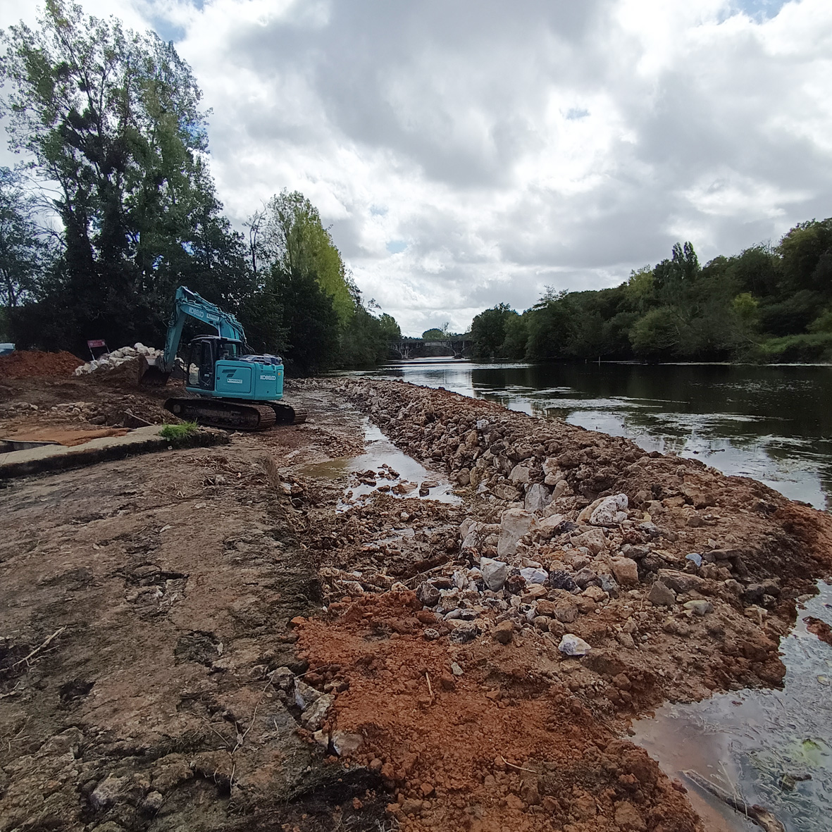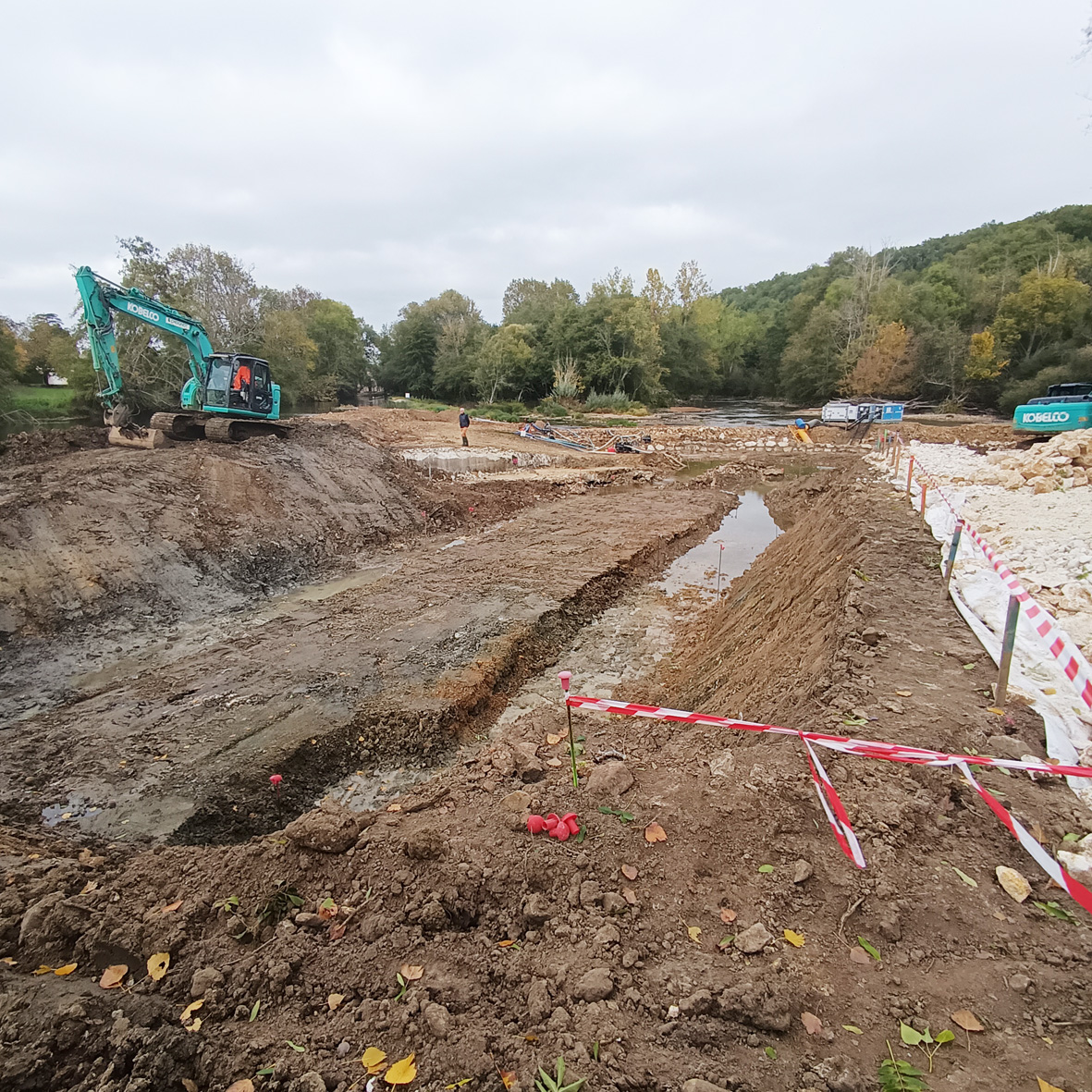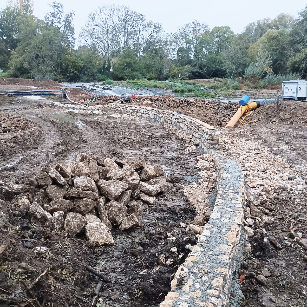 Les travaux de création du batardeau permettant la mise hors d’eau du chantier ont débuté le 15 septembre 2025. Une pêche de sauvetage a été réalisée par la Fédération Départementale de Pêche et de Protection des Milieux Aquatiques de la Vienne le 24 septembre 2025 avant la mise en assec total du chantier.